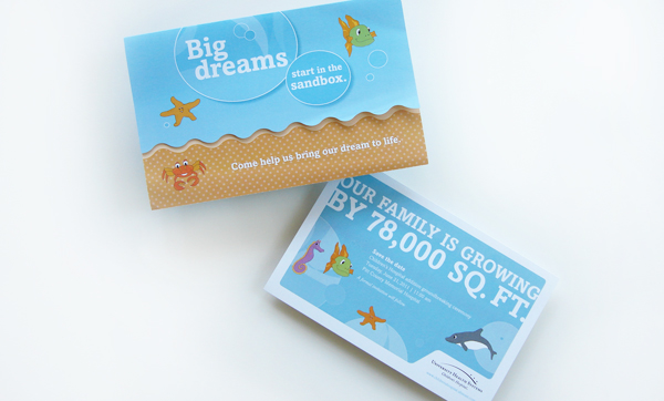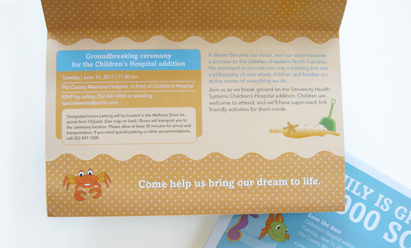 To care for the children of their growing community, Vidant Health (formerly University Health Systems) Children's Hospital is expanding. To celebrate the expansion, guests from the local community were invited to the ground breaking event. The invitation and save the date card were inspired by the hospital's fun-filled sea creature theme.