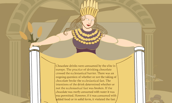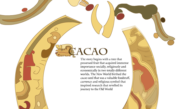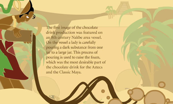 The History of Chocolate is an interactive site that tells the story of how chocolate began in Mexico and traveled to South America and Europe. The illustrative scenes and characters were inspired by the Ancient Mayan tomb drawings and hieroglyphics. Each character within the scenes provides a piece of the story.