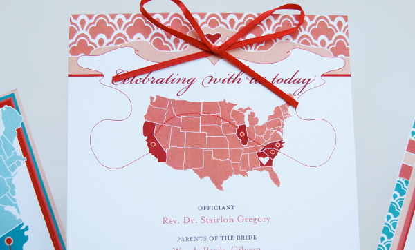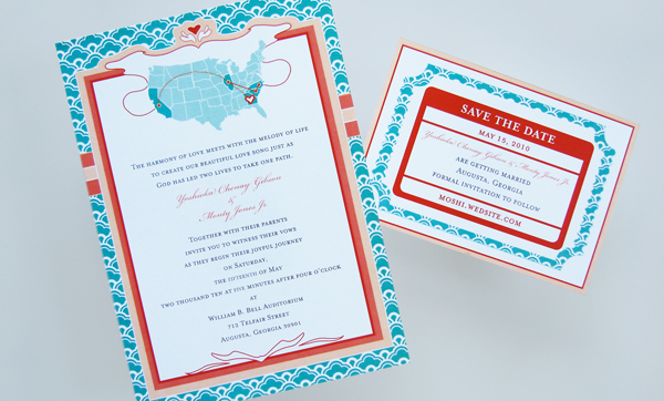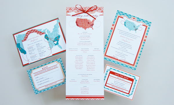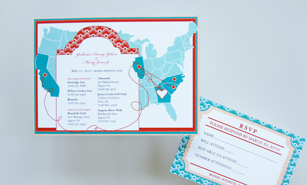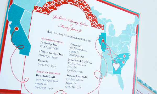 Monty and Yoshioka came from opposite ends of the country but their paths crossed in Chicago before uniting in Georgia. The wedding stationary shows the path they took to find true love using clean lines, contrasting colors and complimenting textures.